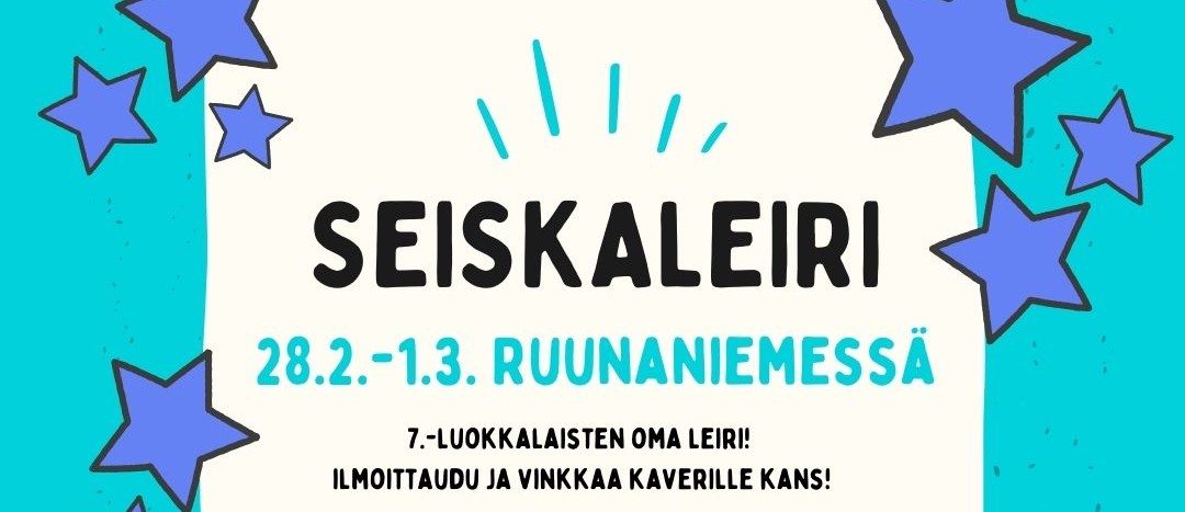 Seiskaleiri 7.-luokkalaisille. Ohjelmassa mukavaa tekemistä ja olemista, pelailua, ulkoilua ja kaikkea muuta kivaa! Leirille voi ilmoittautua yöpymään tai päiväleiriläiseksi. Lisätietoja voit kysyä Emmalta 0400 143 293. Ennen leiriä saat leirikirjeen sähköpostiisi, jossa lisäinfoa leiristä. Ilmoittautuminen tapahtuu TÄSTÄ